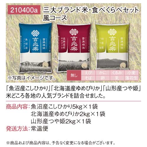 「魚沼産こしひかり」「北海道産ゆめぴりか」「山形産つや姫」米どころ各地の人気ブランドを詰合せました。