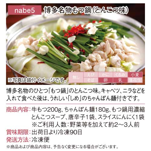 | 牛もつ200g、ちゃんぽん麺180g、もつ鍋用濃縮とんこつスープ、唐辛子1袋、スライスにんにく1袋 ※ご利用人数:野菜等を加えて約2〜3人前 |