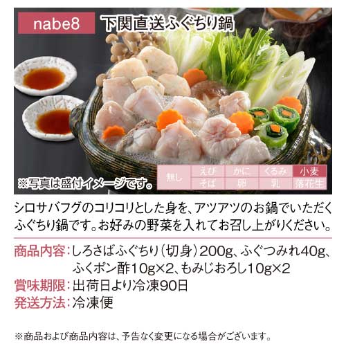 | しろさばふぐちり(切身)200g、ふぐつみれ40g、ふくポン酢10g×2、もみじおろし10g×2 |