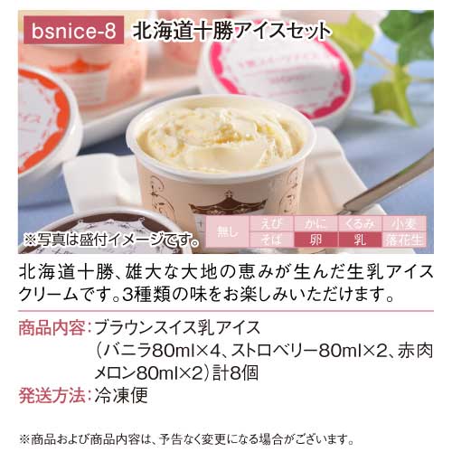 | 内容量 | ブラウンスイス乳アイス(バニラ80ml×4、ストロベリー80ml×2、赤肉メロン80ml×2)計8個 |