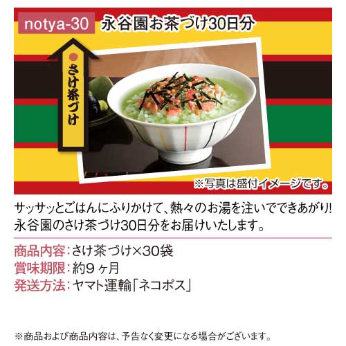 サッサッとごはんにふりかけて、熱々のお湯を注いでできあがり!「いつもあなたのそばにいる。」永谷園のお茶漬けを30日分お届けいたします。