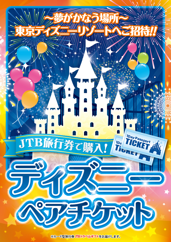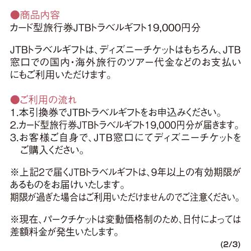 もらってうれしい『ディズニーチケット』!(注)当店では、1デーパスポートそのものではなく「カード型旅行券JTBトラベルギフト19,000円分」を引換商品としてご用意しております。 JTB窓口にてディズニーチケットの購入が可能です。