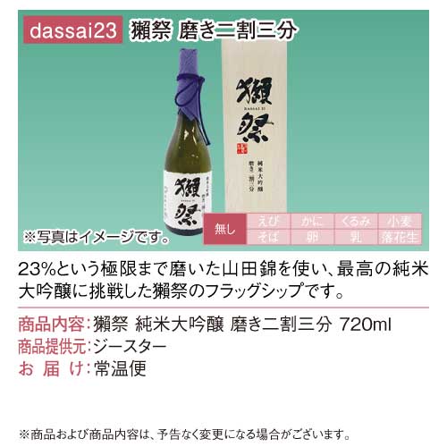 23%という極限まで磨いた山田錦を使い、最高の純米大吟醸に挑戦しました。華やかな上立ち香と口に含んだときのきれいな蜂蜜のような甘み、飲み込んだ後口はきれいに切れていきながらも長く続く余韻。獺祭のフラッグシップ。