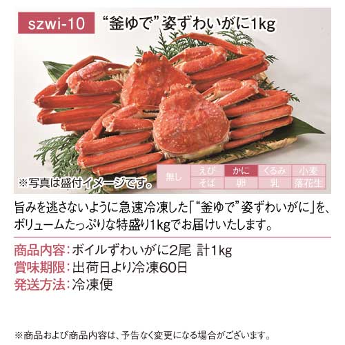 旨みを逃さないように急速冷凍した「“釜ゆで”姿ずわいがに」を、ボリュームたっぷりな特盛り1kgでお届けいたします。身がしまった繊細な甘みをお楽しみください。