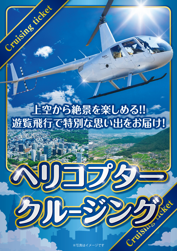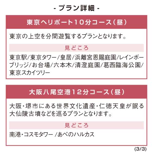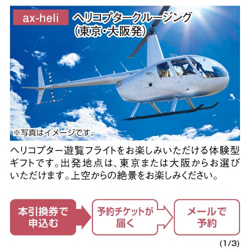 ヘリコプター遊覧フライトをお楽しみいただける体験型ギフトです。出発地点は、東京または大阪からお選びいただけます。上空からの絶景をお楽しみください。