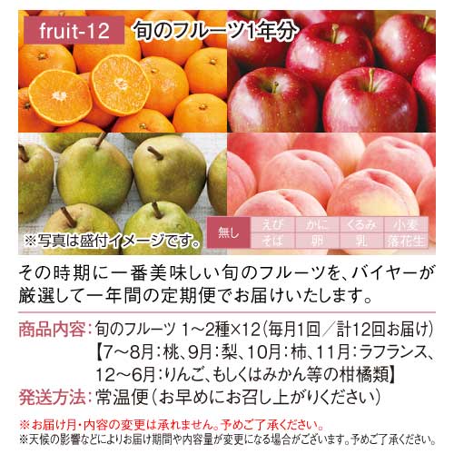 | 内容量 | 旬のフルーツ 1〜2種×12 (毎月1回/計12回お届け) 【7~8月:桃、9月:梨、10月:柿、11月:ラフランス、12~6月:りんご、もしくはみかん等の柑橘類】 |
