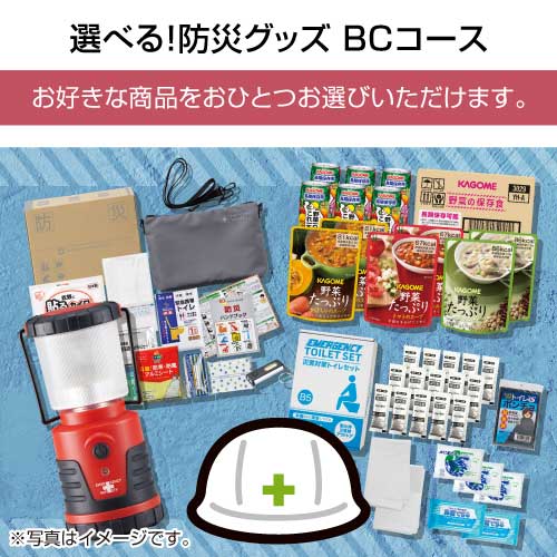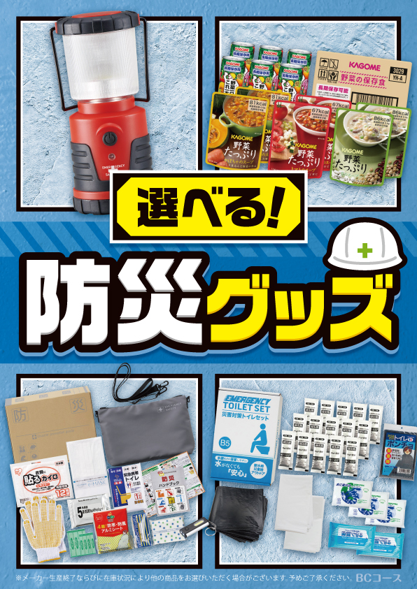 様々な災害を想定した防災用品の中から、お好きな商品をおひとつお選びいただけます。